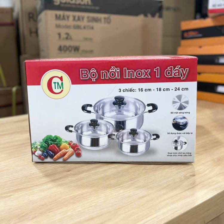 Trang chủ » Sản phẩm » Tất cả sản phẩm » Gia Dụng » Bộ Nồi Inox » Bộ 3 nồi 1 đáy inox CTM cao cấp